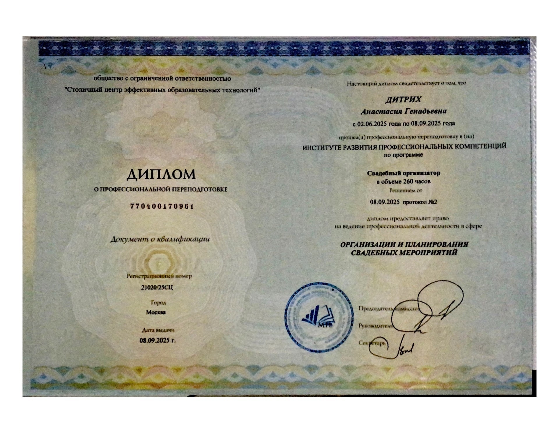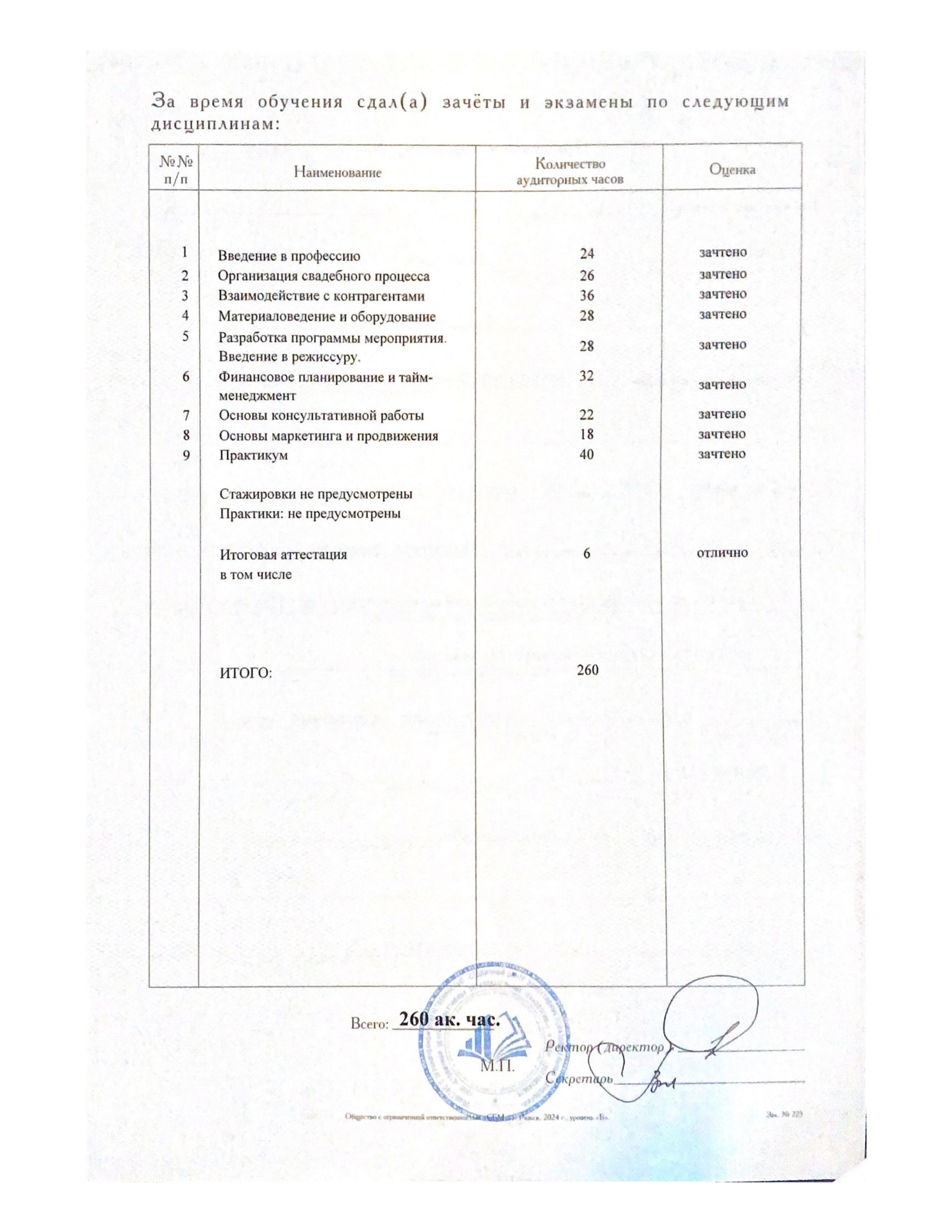 Чтобы организация вашей свадьбы прошла идеально, я успешно прошла специальное обучение в топовом московском агентстве.